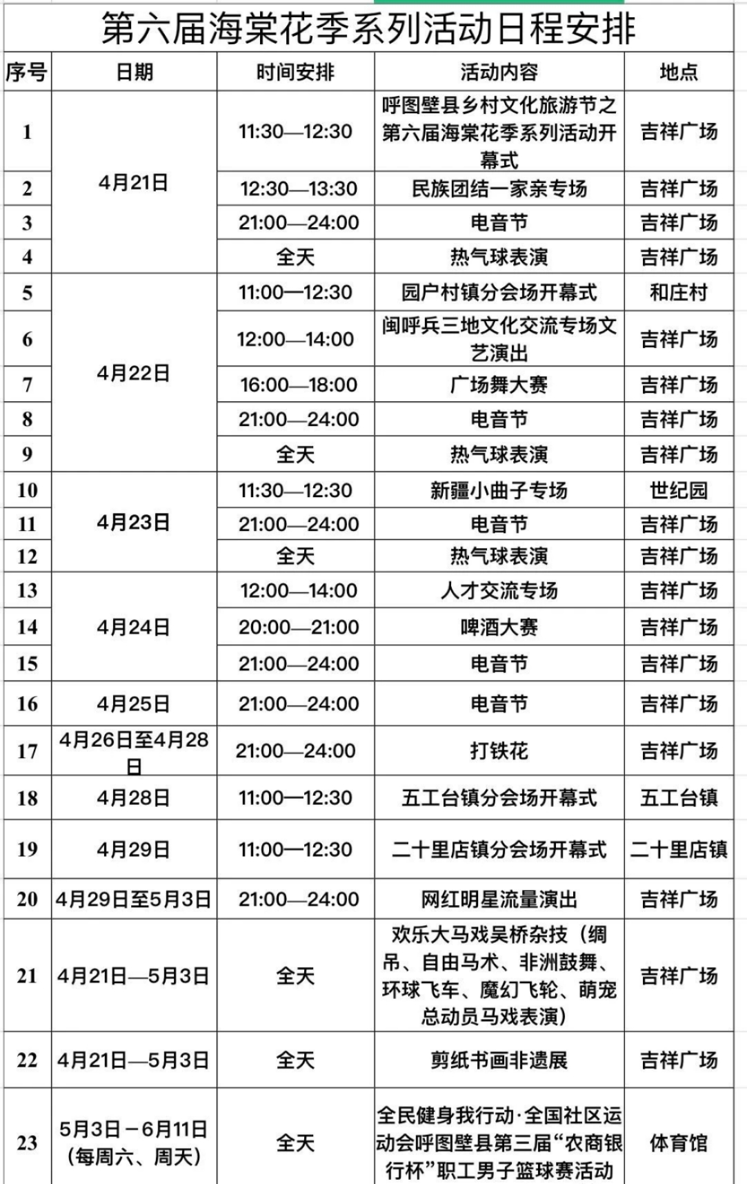 分会场:二十里店镇二十里店村、二十里店海棠园五工台镇幸福村、五工台镇海棠园园户村镇和庄村呼图壁县世纪园、馨天地景区三、活动主题