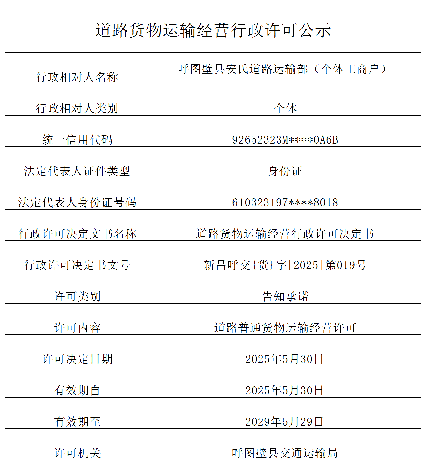 【行政许可】呼图壁县交通运输局行政许可公示(新昌呼交【货】[2025]第019号)