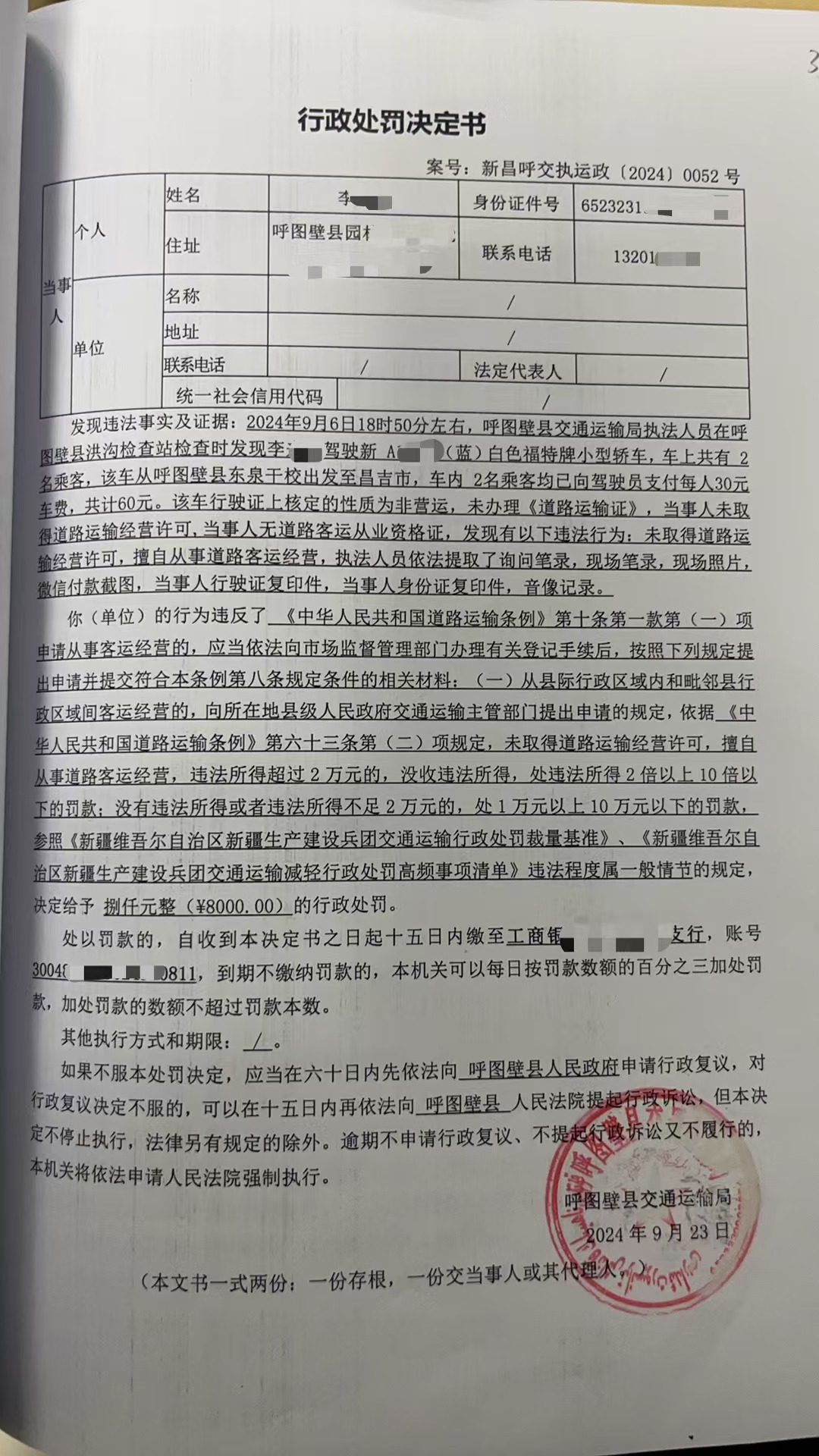 【行政处罚】呼图壁县交通运输局行政处罚决定书新昌呼交执运政[2024]0052号