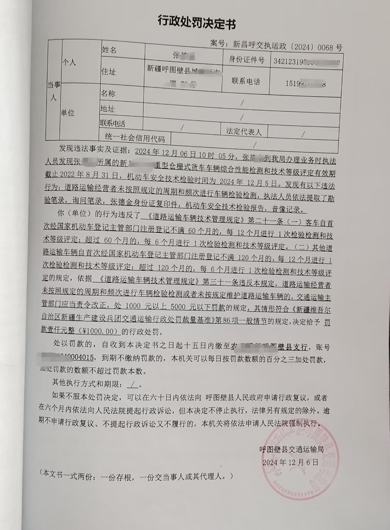 【行政处罚】呼图壁县交通运输局行政处罚决定书新昌呼交执运政[2024]0068号