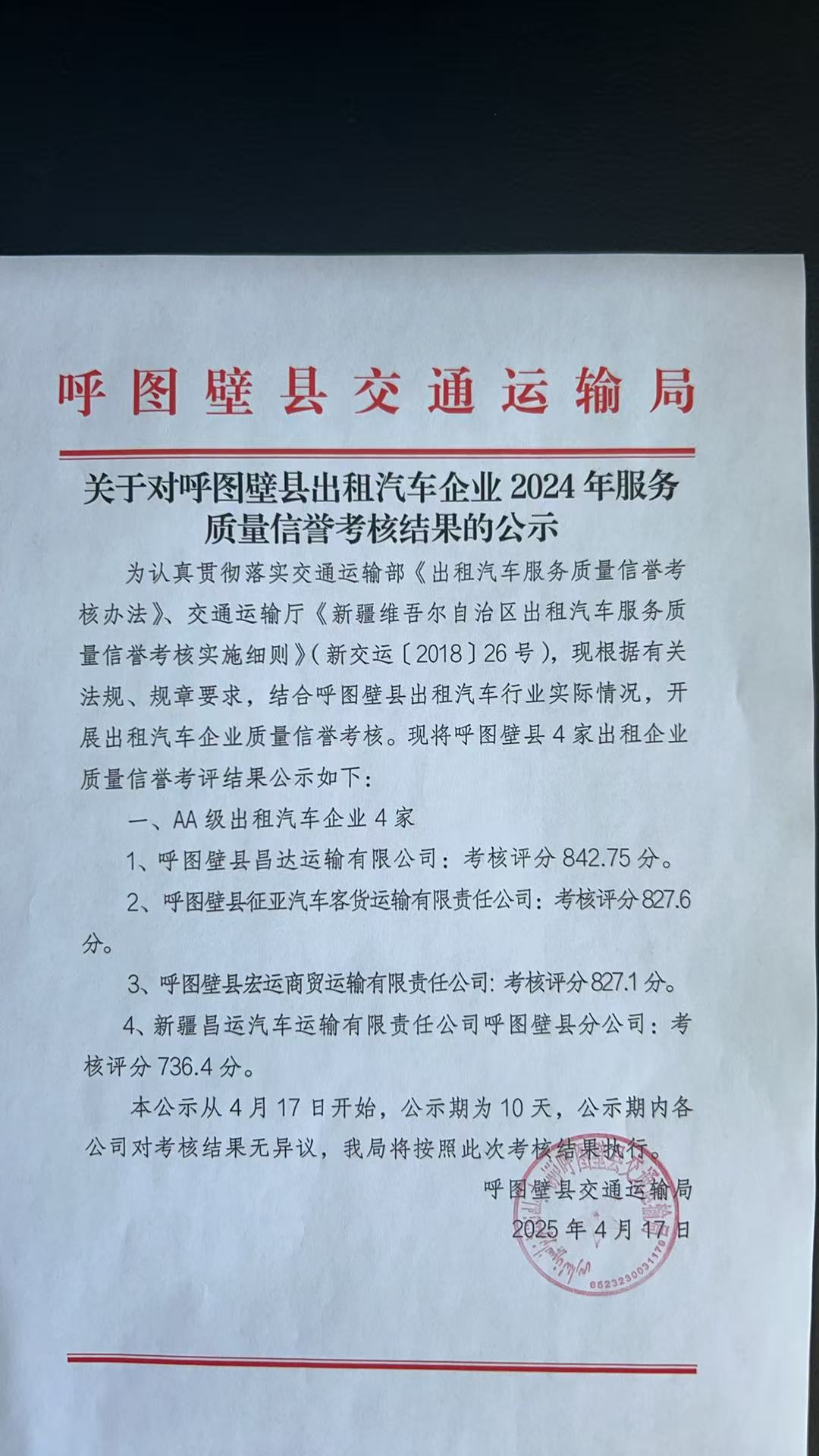 【公示】关于对呼图壁县出租汽车企业2024年服务质量信誉考核结果的公示