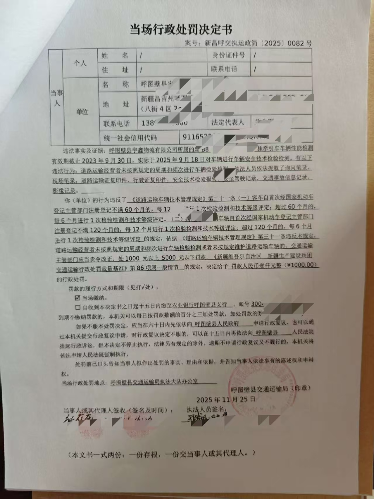 【行政处罚】呼图壁县交通运输局行政处罚决定书新昌呼交执运政简[2025]0082号