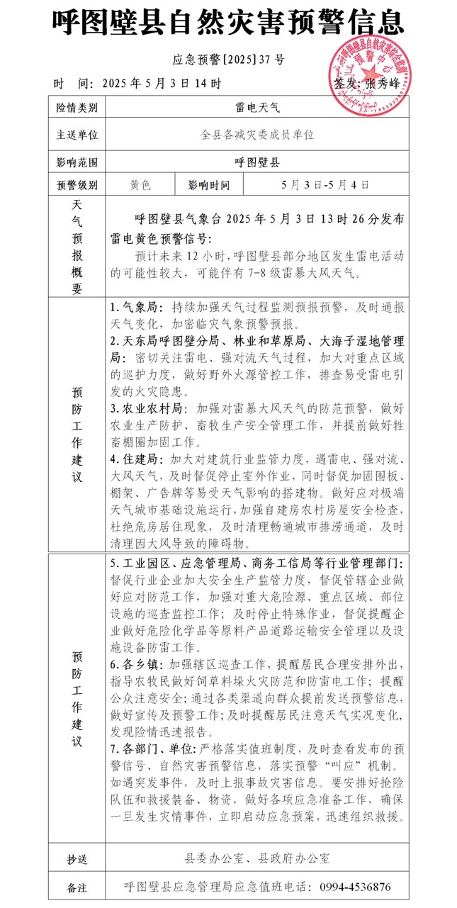 呼图壁县自然灾害预警信息 应急预警[2025]37号