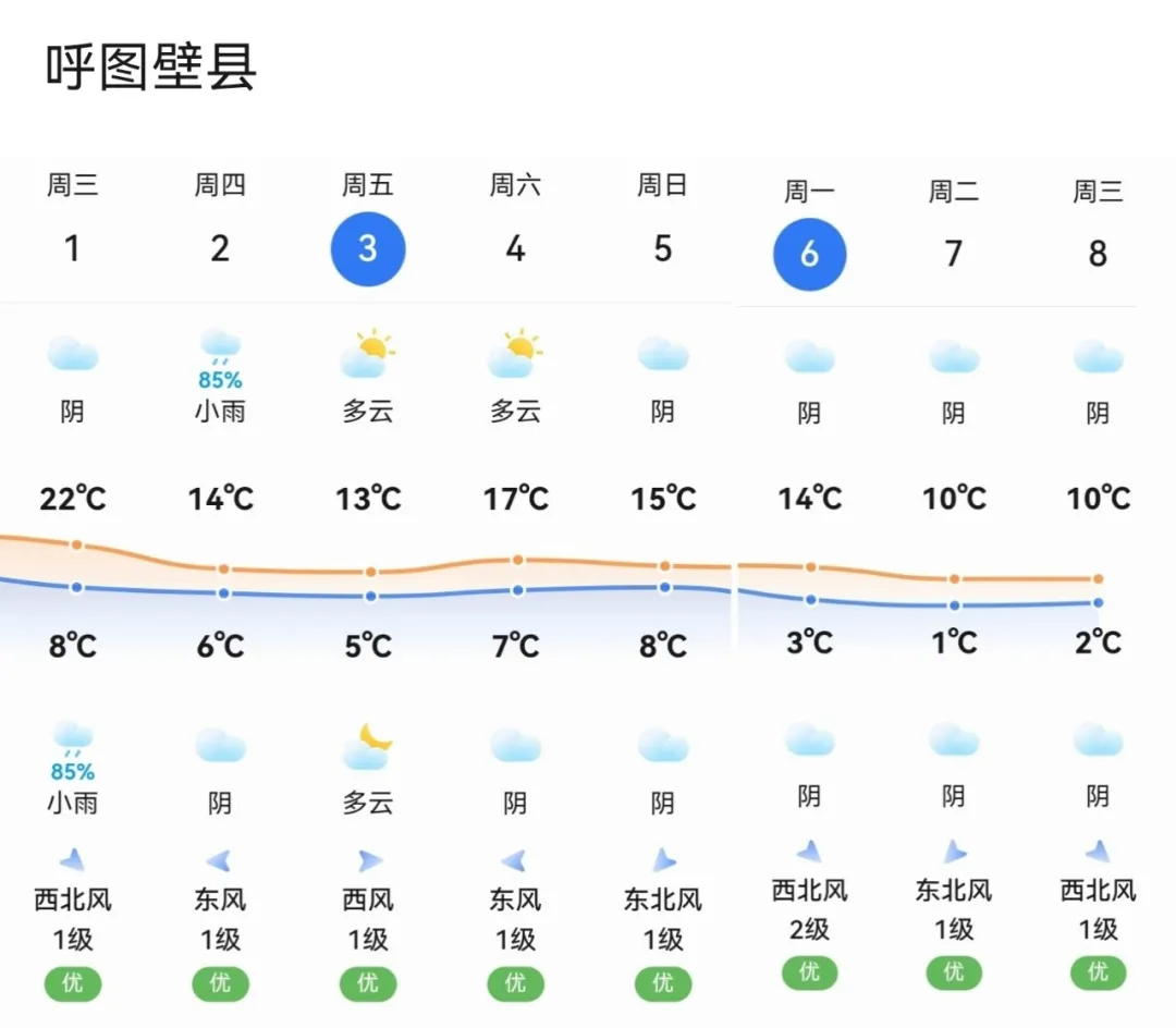 假期期间呼图壁县天气以阴天为主,请广大交通参与者外出时,注意行车安全,及时关注天气状况,提前规划出行时间和线路。