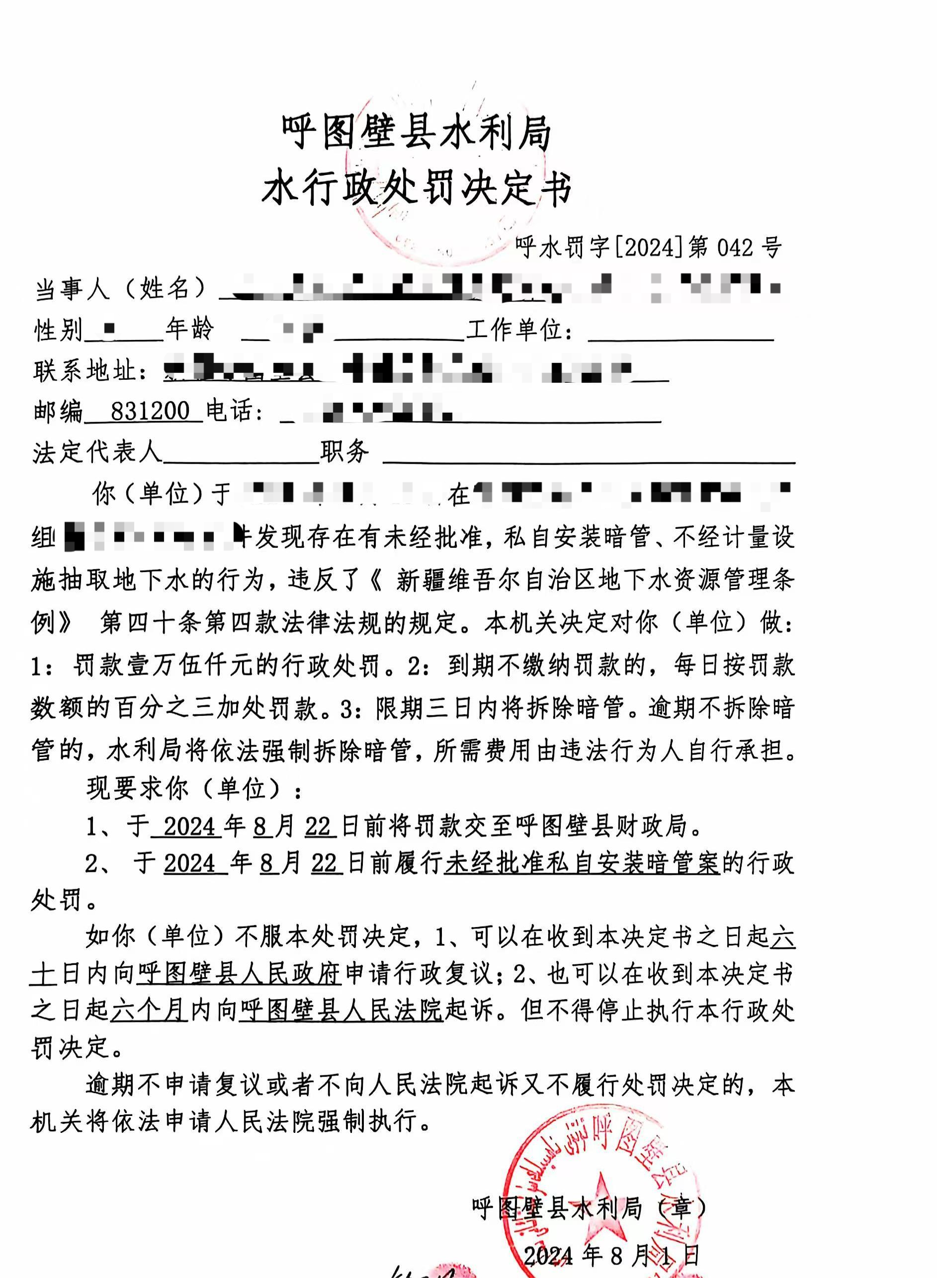 【行政处罚】呼图壁县水利局行政处罚公示(呼水罚字[2024]第042号)