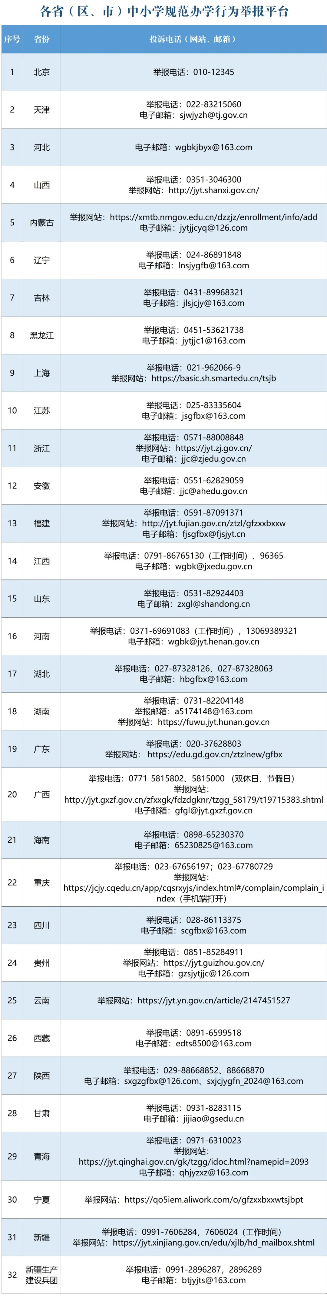 同时,教育部还统一公布了各省(区、市)教育行政部门中小学规范办学行为投诉举报电话和电子邮箱等,畅通举报渠道,接受社会监督。