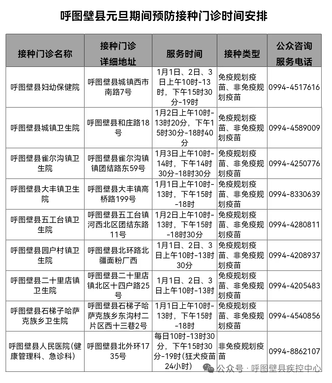 冬春季节是流感、肺炎等呼吸道传染病的高发期,及时接种疫苗是保护自己和家人健康最有效的方式之一。元旦假期(2026年1月1日至1月3日)期间,为方便居民接种,呼图壁县多家预防接种门诊将照常开放,持续提供疫苗接种服务。
