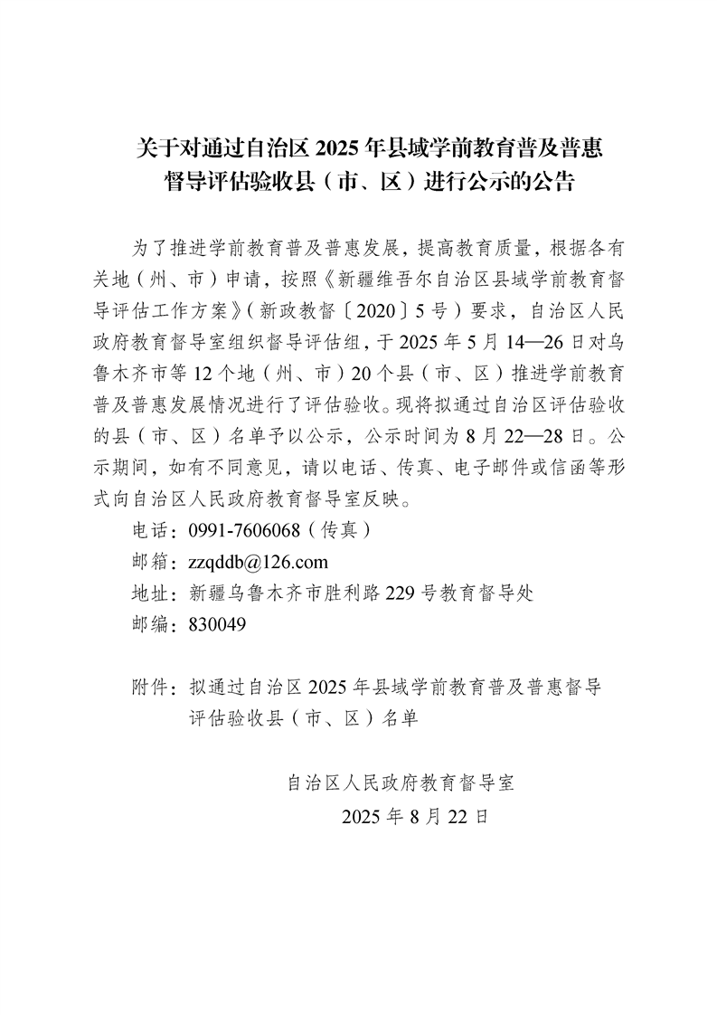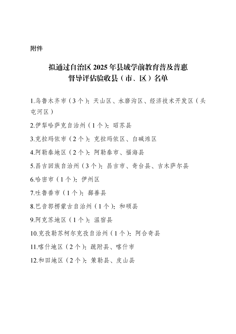 【义务教育】关于对通过自治区2025年县域学前教育普及普惠督导评估验收县(市、区)进行公示的公告